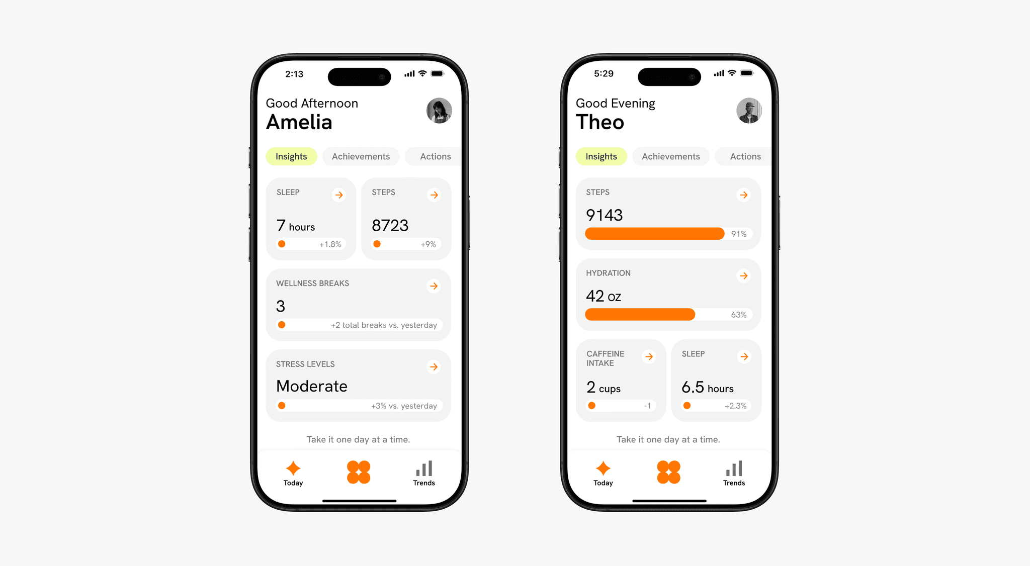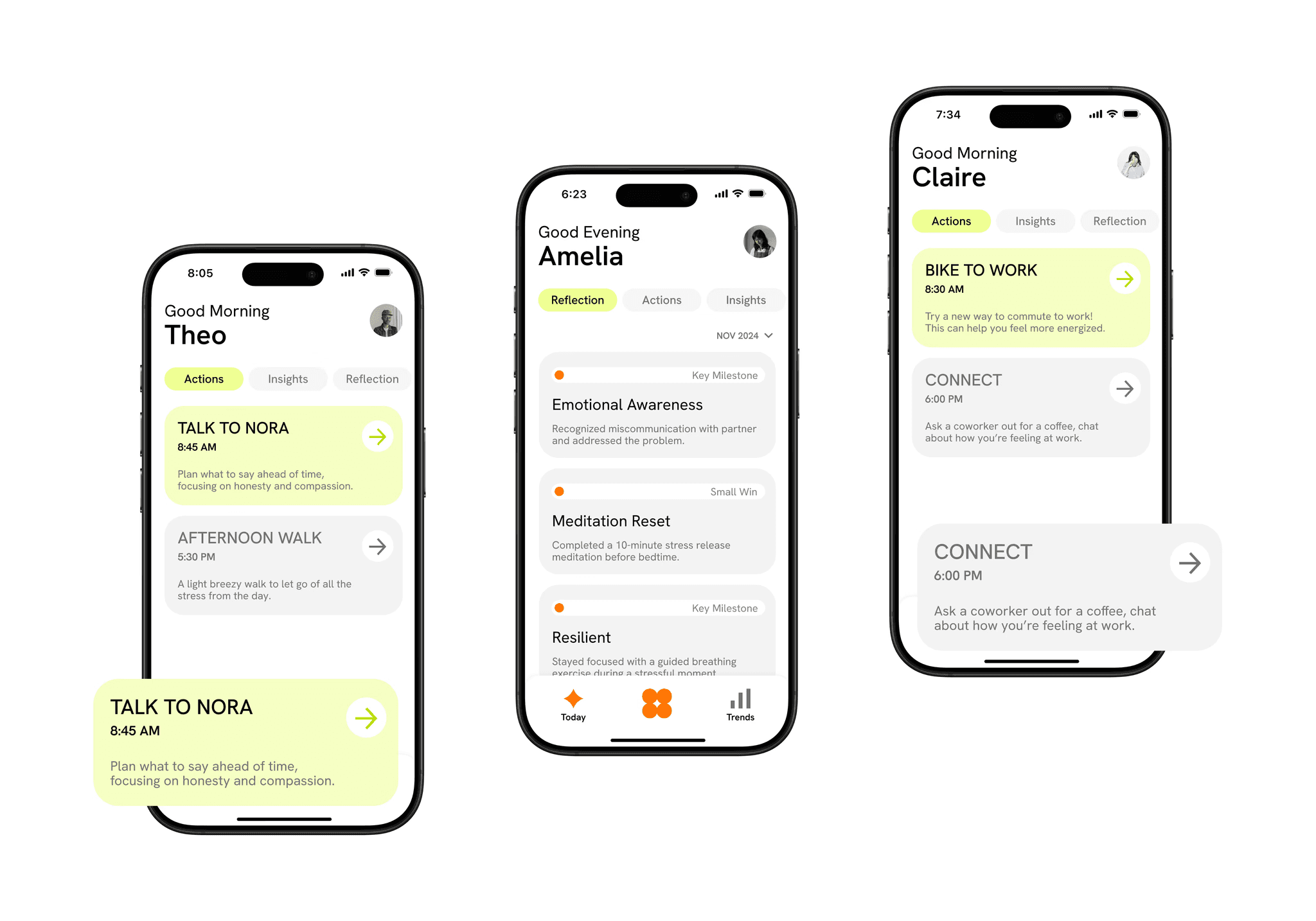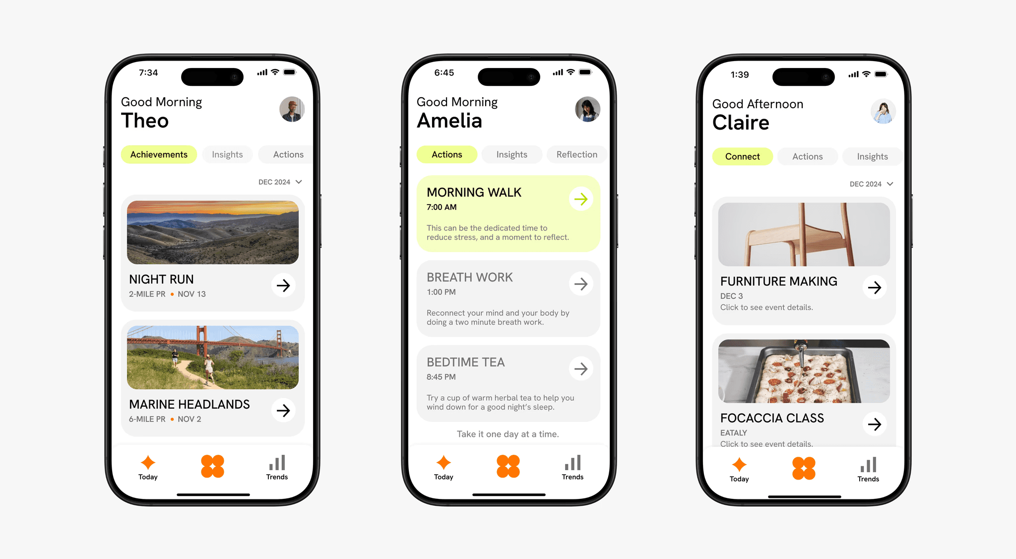 The app's home screen adapts its content, surfacing 'Actions,' 'Achievements,' or 'Reflections', based on the user's primary goal at that moment in their life to personalise the experience.